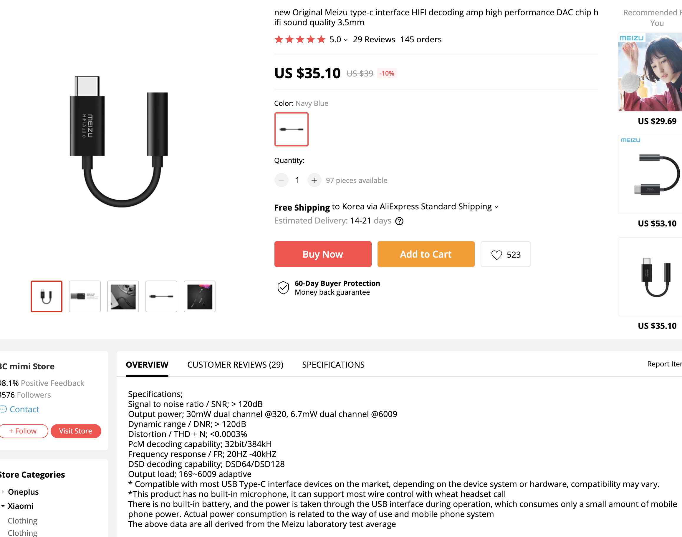 인터넷을 뒤지다 보니 메이쥬에서 Hifi DAC 을 장착한 USB-C <-> 3.5mm 젠더가 있다는 소식을 듣고 바로 알리에서 주문.