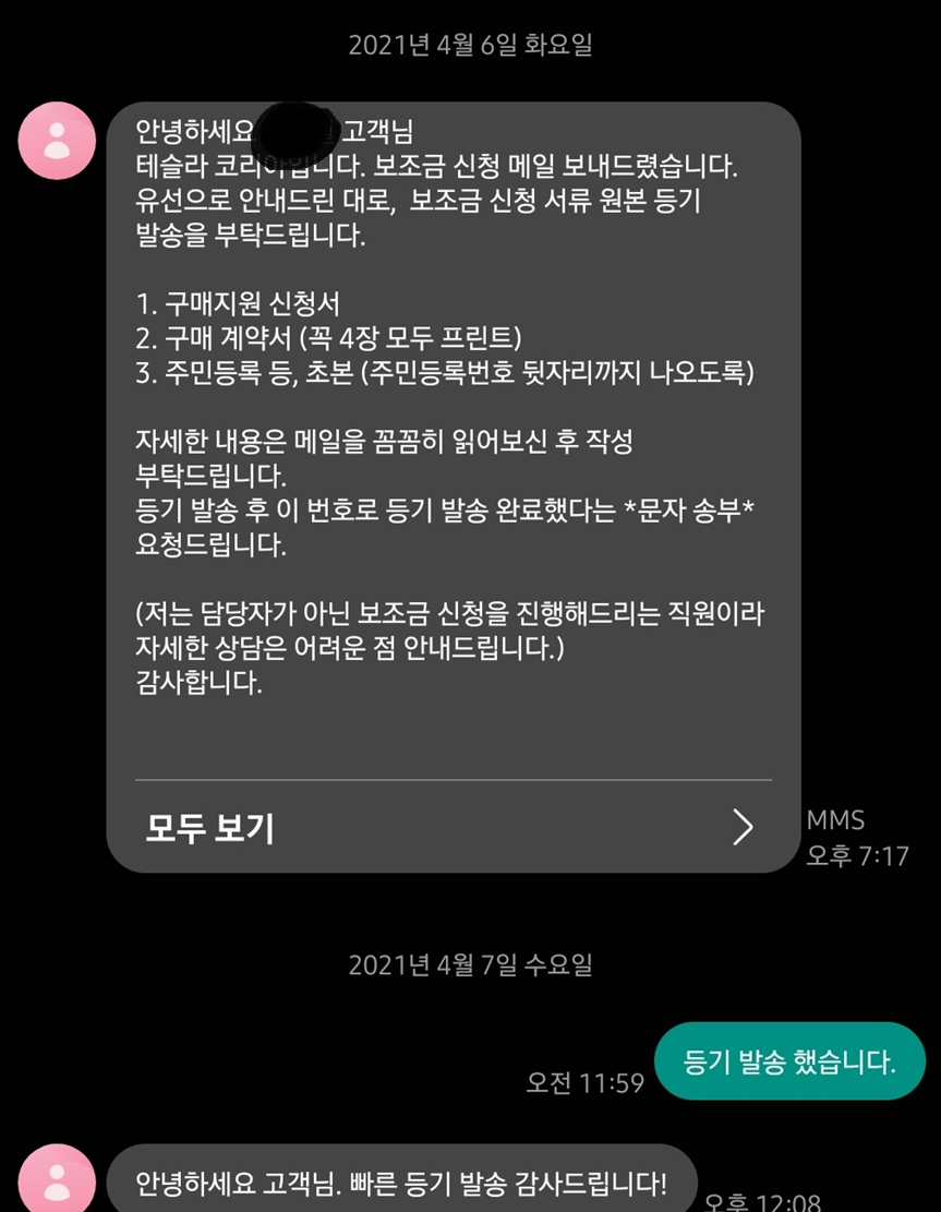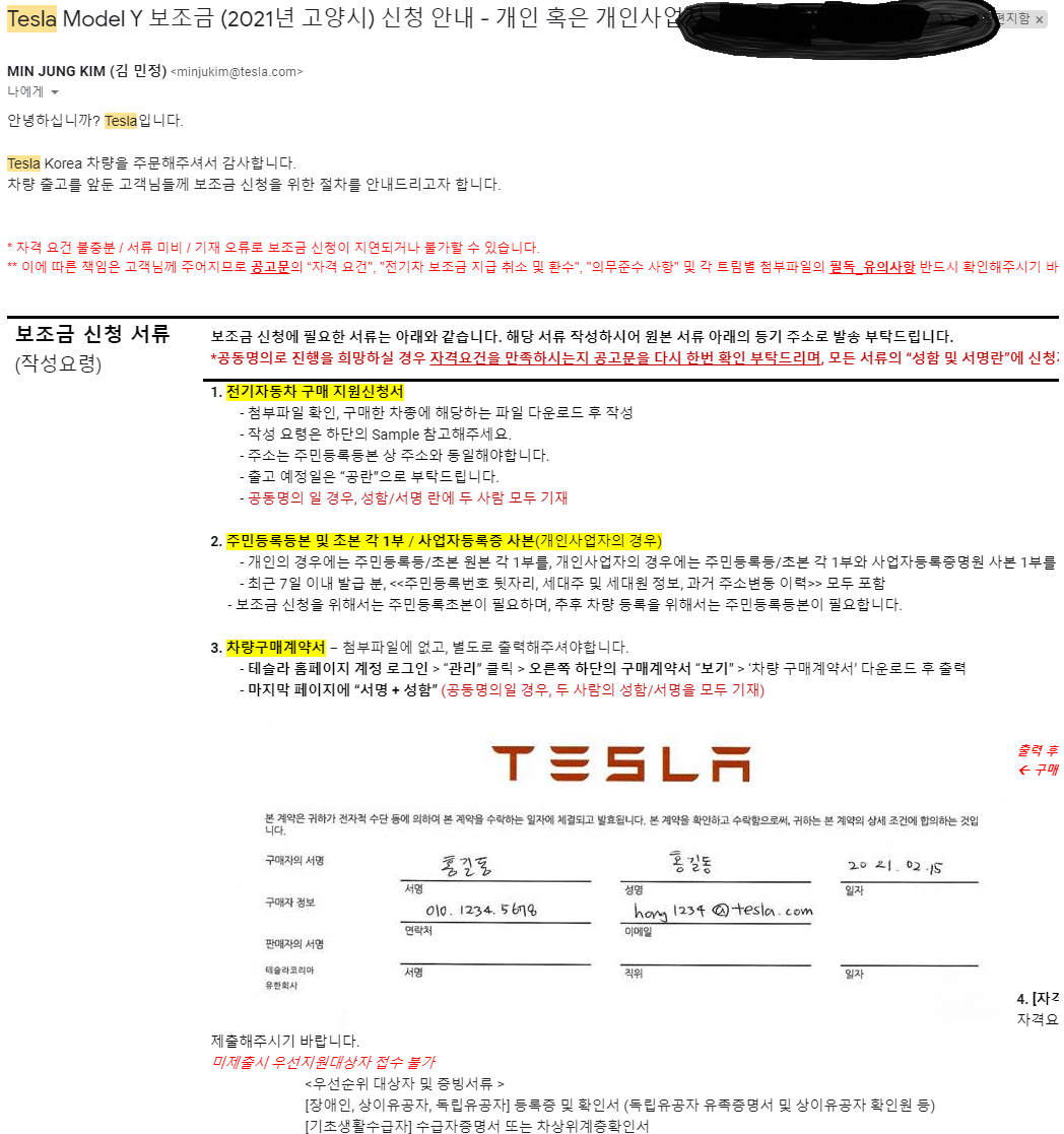 를 작성해서 테슬라코리아로 우체국 등기로 보냄.