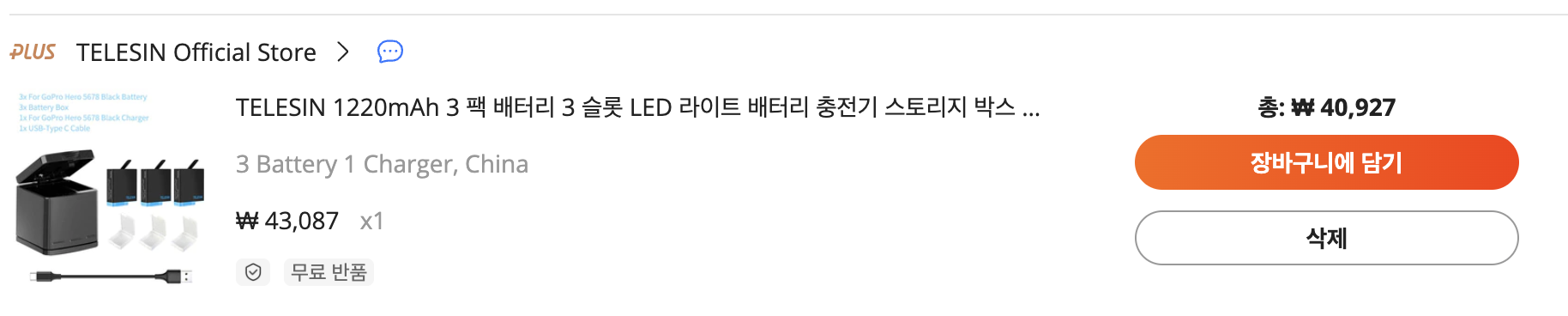 알리에서 TELESIN 고프로 호환 배터리 3개 + 충전기 40,927원에 구입했습니다. 22-10-06일에