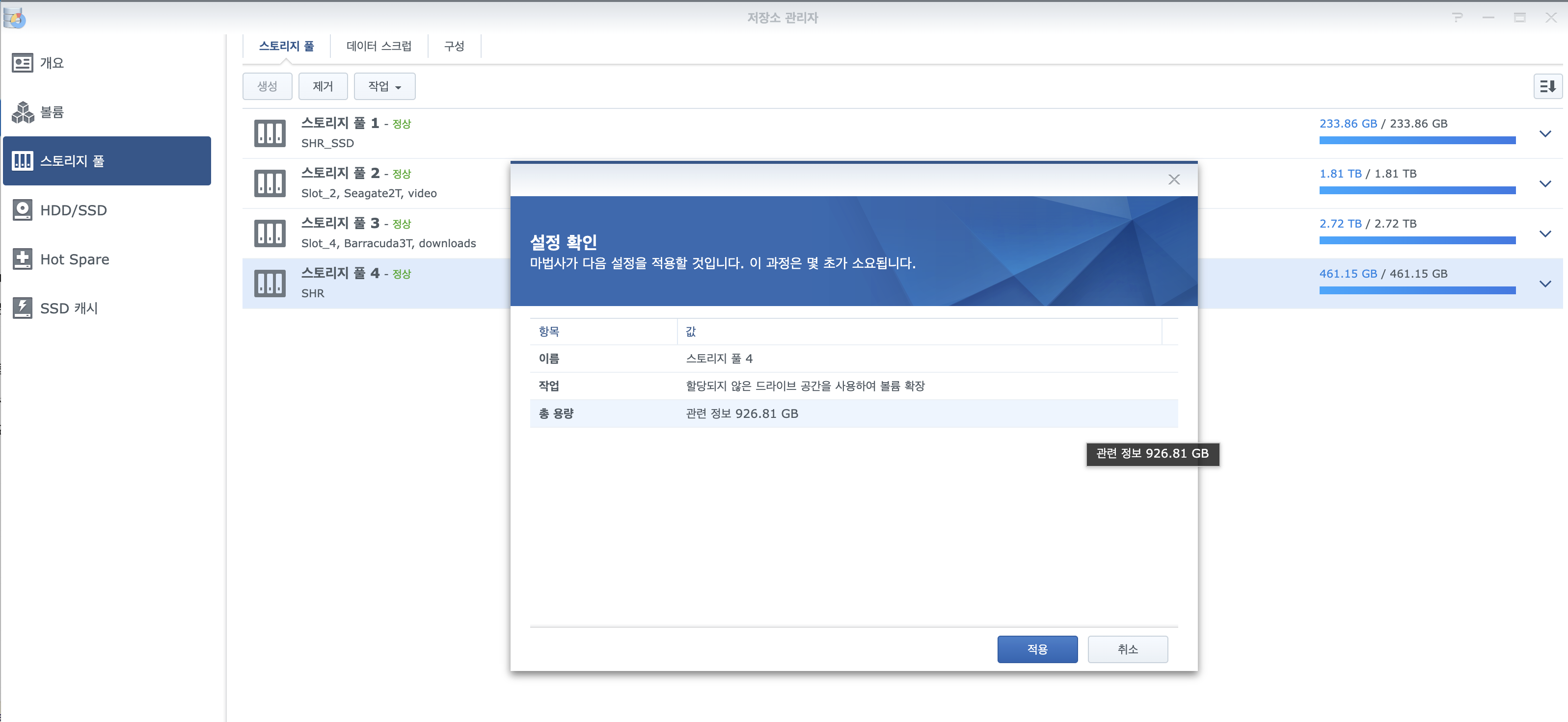 저장소 관리자 -> 스토리지 풀 -> 바꾼 HDD를 선택 -> 작업 -> 확장