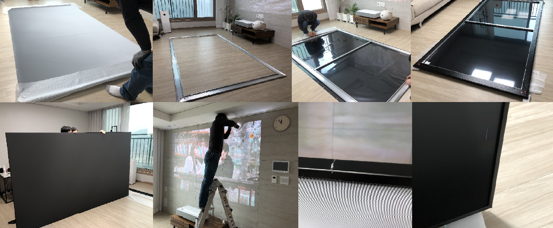 그래도 업계 통밥이 있는지 한번 보고는 어찌저찌 설치는 하기 시작했다. 프레임을 이쪽에 대보고 저쪽에 대보고 방향을 잘 모르는 느낌이 어째 불안 불안... ㅠ 스크린 펼치는것도 뭔가 좀 엉성한데... 느낌이 좋지 않았다. 스크린 원단 자체가 워낙에 예민하다고 하면서 거실 바닥을 여러번 청소기로 밀고 아주 조심조심 조립을 했다.