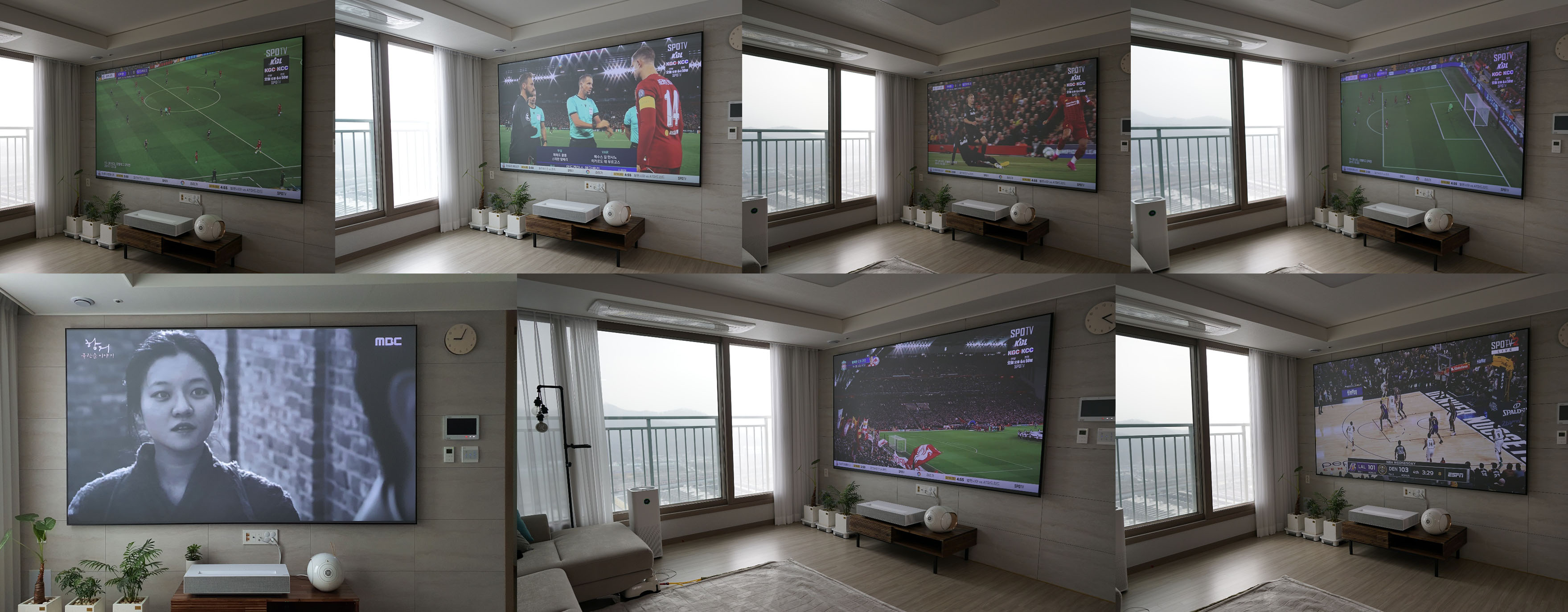 어쨌던 120인치 설치하니 기분이 좋았다. 벽에 박았더니 보기에도 뭐.. 우려와 다르게 거실이 어두워보이거나 그런건 크게 느껴지지 않고 그냥 거대한 TV들여놓은 기분이었다.