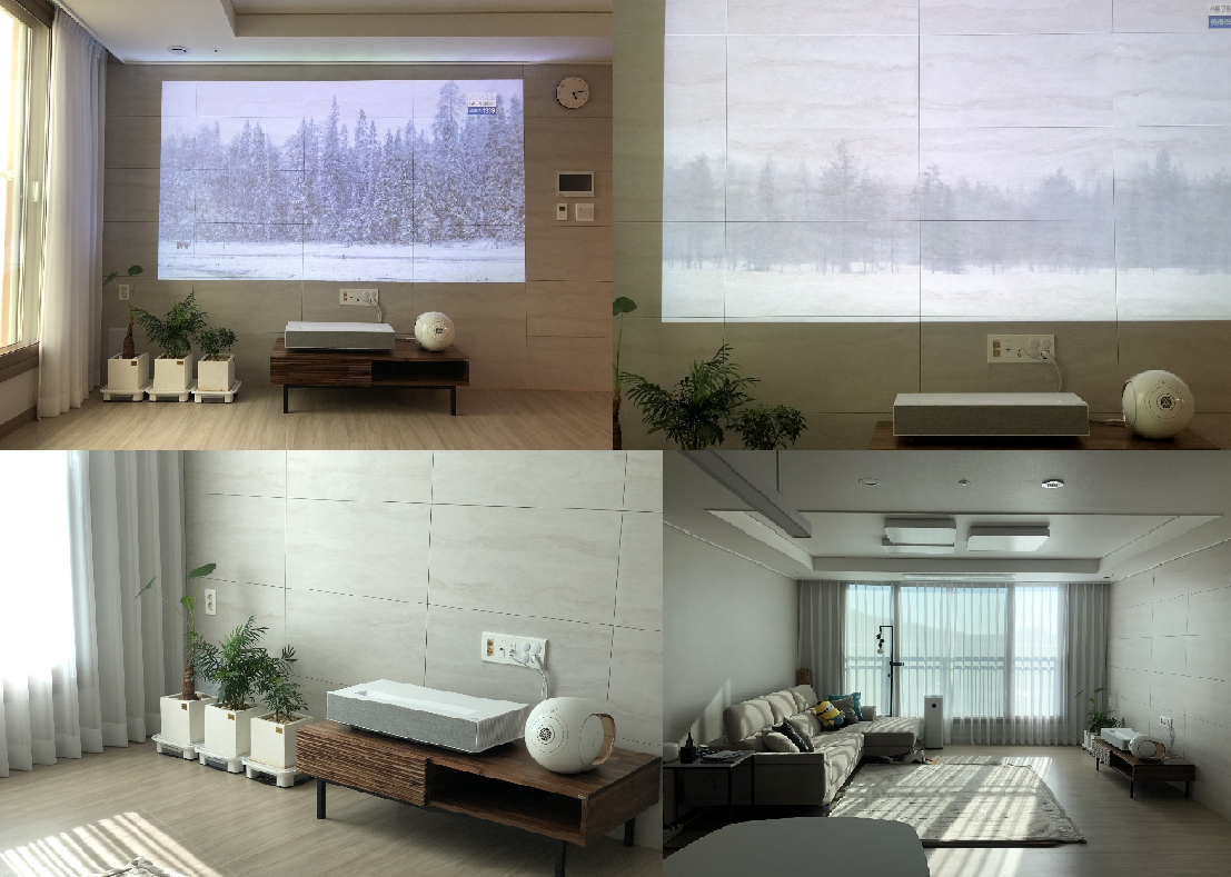 그냥 맨 벽에다 대고 쏘면 프로젝터 빛이 천정으로 일정 부분 반사되는데 CLR 광학 스크린을 설치하고나서는 그런것은 없어졌다.