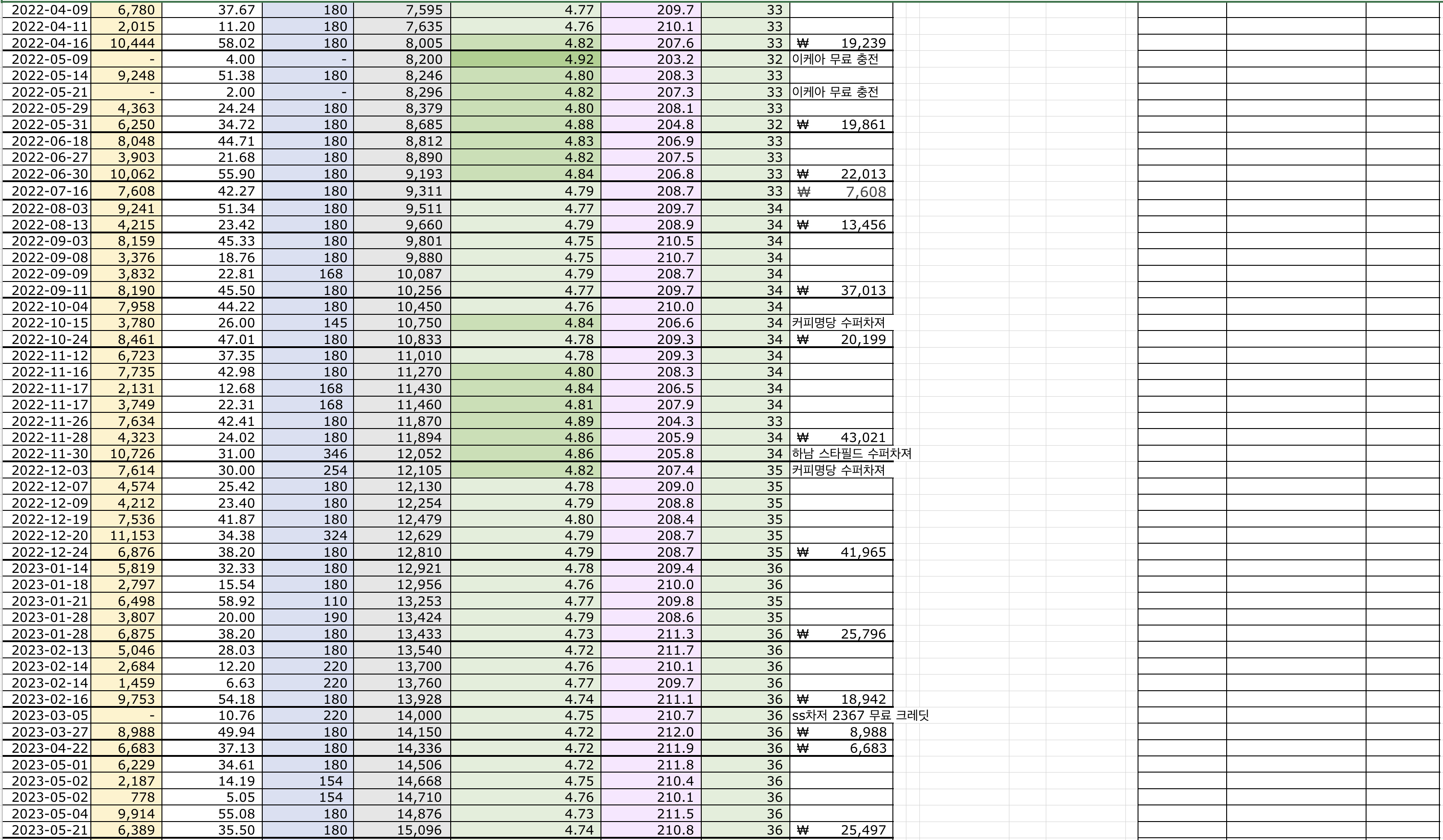 제가 기록하고 있는 것은 충전기에 찍힌 값으로 기록하고 있기 때문에 충전중 손실도 적용된 값이고, 주행뿐 아니라 그냥 에어컨 사용이나 이런 잡스런 생활 패턴까지 모두 적용된 값이니 참고 하시면 될 것 같습니다.